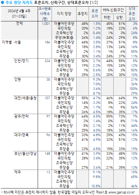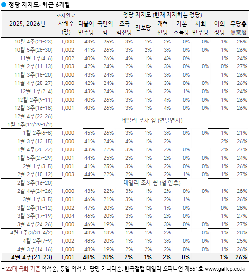 2026³â 4¿ù ³Ý° ÁÖ(21~23ÀÏ) ÇöÀç ÁöÁöÇÏ´Â Á¤´çÀº(´ç¸í ·ÎÅ×À̼Ç, ÀçÁú¹® 1ȸ) ´õºÒ¾î¹ÎÁÖ´ç 48%, ±¹¹ÎÀÇÈû 20%, Á¶±¹Çõ½Å´ç, °³Çõ½Å´ç °¢°¢ 2%, Áøº¸´ç, ÀÌ¿Ü Á¤´ç/´Üü °¢°¢ 1%, ÁöÁöÇÏ´Â Á¤´ç ¾ø´Â ¹«´ç(ÙíÓÚ)Ãþ 26%´Ù. ´ëÅü·É Á÷¹« ±àÁ¤·ü°ú ¹ÎÁÖ´ç ÁöÁöµµ´Â 4¿ù µé¾î Çö Á¤ºÎ Ãâ¹ü ÈÄ ÃÖ°í ¼öÁØÀÌ´Ù. ±¹¹ÎÀÇÈûÀº 2¿ù ÃÊ 25%¿¡¼ 4¿ù ÃÊ 18%(Çö Á¤ºÎ Ãâ¹ü ÈÄ ÃÖÀúÄ¡)±îÁö Ç϶ôÇÏ´Â µî Çö Á¤ºÎ Ãâ¹ü ÈÄ °¡Àå ³·Àº ¼öÁØ¿¡ ¸Ó¹®´Ù. ÀÛ³â 8¿ù Áß¼øºÎÅÍ ¿ÃÇØ 1¿ù±îÁö´Â ¹ÎÁÖ´ç ÁöÁöµµ 40% ³»¿Ü, ±¹¹ÎÀÇÈû 20%´ë ÃÊÁß¹Ý ±¸µµ¿´´Ù.