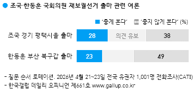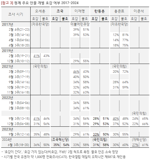 ¡Ý Á¶±¹°ú Çѵ¿ÈÆÀº °¢°¢ ¹®ÀçÀηÀ±¼®¿ Á¤ºÎ ½ÃÀý ¹ý¹«ºÎ Àå°üÀ̾ú´Ù. Àå°ü Àλçû¹®È¸ ÈÄ ÀûÇÕ ¿©·ÐÀº Á¶±¹ 36%(2019³â 9¿ù ¹ÎÁÖ´ç ÁöÁöÃþ 72%, Áøº¸Ãþ 69%, → Á¦370È£), Çѵ¿ÈÆ 44%(2022³â 5¿ù ±¹¹ÎÀÇÈû ÁöÁöÃþ 72%, º¸¼öÃþ 63%, → Á¦495È£)¿´´Ù. 2024³â 6¿ù ±âÁØ Á¤°è ÁÖ¿ä Àι° °³º° È£°¨µµ('È£°¨ °£´Ù' ÀÀ´ä)´Â Á¶±¹ 35%(Áøº¸Ãþ 64%), Çѵ¿ÈÆ 31%(º¸¼öÃþ 56%)¿´´Ù(→ Á¦587È£).