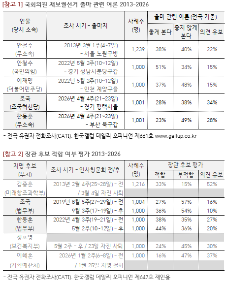 ¡Ý Âü°í·Î, 4³â Àü Áö¹æ¼±°Å¿Í ÇÔ²² Ä¡·¯Áø ±¹È¸ÀÇ¿ø º¸±È¼±°Å¿¡´Â Á¦20´ë ´ëÅë·É¼±°Å¿¡¼ ¹ÎÁÖ´ç È帷Π¿ÏÁÖÇÑ ÀÌÀç¸í, ±¹¹ÎÀÇ´ç Èĺ¸¿´´Ù°¡ À±¼®¿°ú ´ÜÀÏÈÇÏ°í ±¹¹ÎÀÇÈû ´ëÅë·ÉÁ÷ÀμöÀ§¿øÈ¸¸¦ À̲ö ¾Èö¼ö°¡ °¢°¢ ÀÎõ °è¾ç±¸À», °æ±â ¼º³²½ÃºÐ´ç±¸°©¿¡ Ãâ¸¶ÇØ ÁÖ¸ñ¹Þ¾Ò´Ù. ´ç½Ã ¾Èö¼ö·ÀÌÀç¸í Ã⸶ °ü·Ã ±àÁ¤·ÐÀº °¢°¢ 51%, 37%¿´°í, ÀÚ´ç ÁöÁöÃþ¿¡¼´Â µÑ ´Ù 70%¸¦ ¿ôµ¹¾Ò´Ù(→ Á¦495È£).