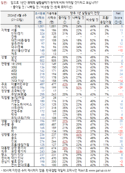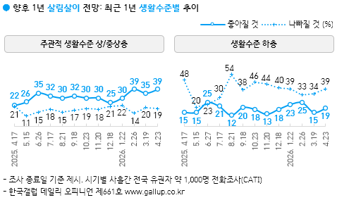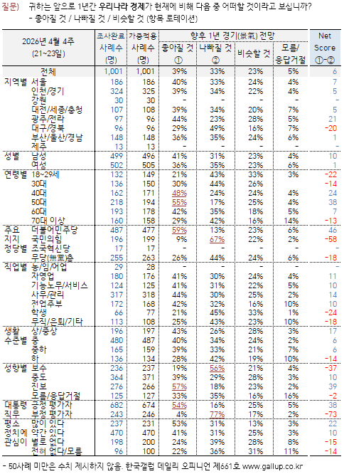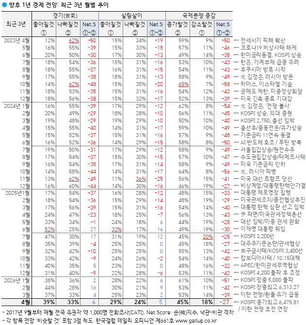 Çѱ¹°¶·´ÀÌ 2026³â 4¿ù 21~23ÀÏ Àü±¹ ¸¸ 18¼¼ ÀÌ»ó 1,001¸í¿¡°Ô ÇâÈÄ 1³â°£ ¿ì¸®³ª¶ó °æ±â Àü¸ÁÀ» ¹°Àº °á°ú 39%°¡ 'ÁÁ¾ÆÁú °Í'À̶ó°í ³»´ÙºÃ°í, 33%´Â '³ªºüÁú °Í', 23%´Â 'ºñ½ÁÇÒ °Í'À̶ó°í ´äÇß´Ù. 5%´Â ÀǰßÀ» À¯º¸Çß´Ù. Àü¿ù ´ëºñ 'ÁÁ¾ÆÁú °Í'À̶õ ÀÀ´ä¸¸ 2%Æ÷ÀÎÆ® ´Ã¾î, ¼öÄ¡»ó ³Ë ´Þ° °æ±â ³«°ü·Ð ¿ìÀ§¸¦ À̾°Ô µÆ´Ù. À̴ ȯÀ²·À¯°¡·¹°°¡ ºÒ¾ÈÁ¤ ¼Ó¿¡¼µµ »çÈê ¿¬¼Ó ÀåÁß·Á¾°¡ ÃÖ°íÁ¡À» °æ½ÅÇÑ ÄÚ½ºÇÇ °¼¼Àå, À̶õ ÀüÀï ÈÞÀü ¿¬ÀåÀ¸·Î ¸»¹Ì¾ÏÀº Á¾Àü ±â´ë°¨ ¿µÇâÀ¸·Î ÃßÁ¤µÈ´Ù.