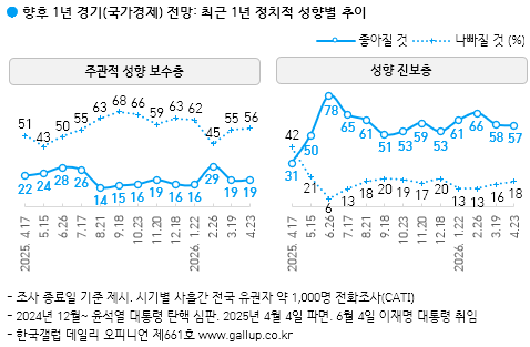 ¼ºÇ⺰ °æ±â Àü¸Á ¼øÁö¼ö´Â Áøº¸Ãþ +39, ÁßµµÃþ +10, º¸¼öÃþ -37; ´ëÅë·É Á÷¹« ±àÁ¤ Æò°¡ÀÚ +38, ºÎÁ¤ Æò°¡ÀÚ -73; ´õºÒ¾î¹ÎÁÖ´ç ÁöÁöÃþ +46, ±¹¹ÎÀÇÈû ÁöÁöÃþ -58´Ù.