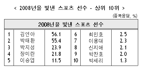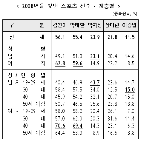 2008³â ÇÑ ÇØ µ¿¾È Çѱ¹À» ºû³½ ½ºÆ÷Ã÷ ¼±¼ö¸¦ 2¸í±îÁö ÀÀ´ä¹ÞÀº °á°ú, ±¹¹ÎÀÇ Àý¹Ý ÀÌ»ó(56.1%)ÀÌ