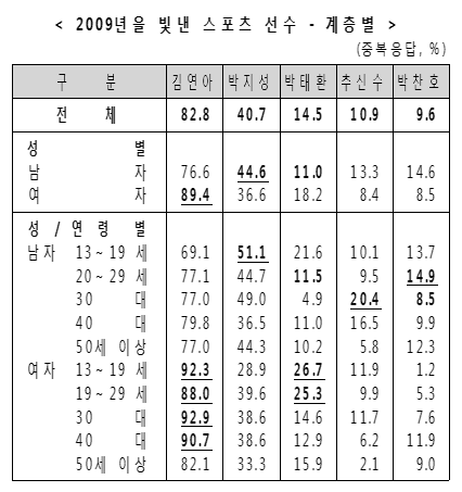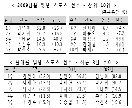 2009³â ÇÑ ÇØ µ¿¾È Çѱ¹À» ºû³½ ½ºÆ÷Ã÷ ¼±¼ö¸¦ 2¸í ±îÁö ÀÀ´ä¹ÞÀº °á°ú, ±¹¹ÎÀÇ 82.8%°¡ ¡®ÇǰÜÄý ±è¿¬¾Æ¡¯¸¦ ²Å¾Ò´Ù. 82.8%´Â º» Á¶»ç°¡ ½Ç½ÃµÈ 2005³â ÀÌÈÄ ÃÖ°í ¼±È£À²ÀÌ´Ù.