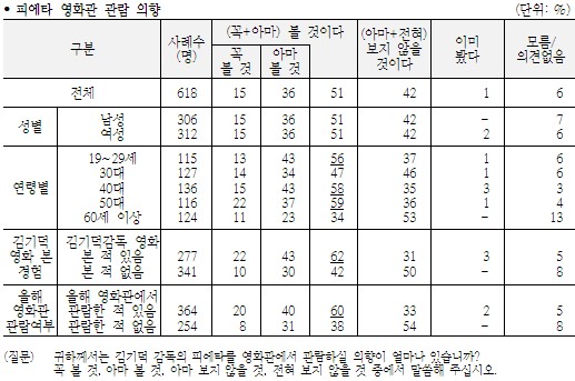 Çѱ¹°¶·´ÀÌ 9¿ù 13~14ÀÏ 2Àϰ£ Àü±¹ ¼ºÀÎ 618¸í¿¡°Ô º£´Ï½º ¿µÈÁ¦ Ȳ±Ý»çÀÚ»óÀ» ¼ö»óÇÑ ÇÇ¿¡Å¸¸¦ ¿µÈ°ü¿¡¼ °ü¶÷ÇÒ ÀÇÇâÀÌ ÀÖ´ÂÁö ¹°Àº °á°ú, ‘²À º¼ °ÍÀÌ´Ù’ 15%, ‘¾Æ¸¶ º¼ °Í °°´Ù’ 36%·Î ¿ì¸® ±¹¹Î Àý¹Ý °¡·®ÀÌ ÇÇ¿¡Å¸ °ü¶÷ ÀÇÇâÀÌ ÀÖ´Â °ÍÀ¸·Î ³ªÅ¸³µ´Ù.