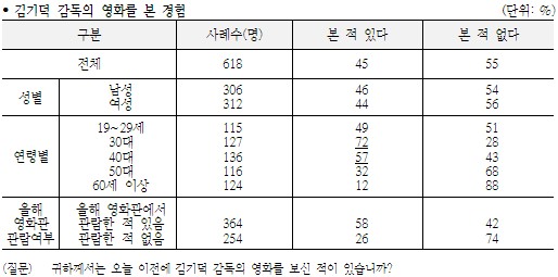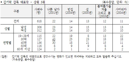 Àüü ÀÀ´äÀÚ(618¸í)¿¡°Ô ÇÇ¿¡Å¸¸¦ Á¦¿ÜÇÑ ±è±â´ö °¨µ¶ÀÇ ´ëÇ¥ÀÛÀ» ¹°Àº °á°ú(º¹¼ö ÀÀ´ä), ‘³ª»Û ³²ÀÚ(2001³â)’¸¦ 22%·Î °¡Àå ¸¹ÀÌ ²Å¾Ò°í ±× ´ÙÀ½Àº ‘ºóÁý(2004³â)’ 14%, ‘¼¶(2000³â)’ 13%, ‘º½¿©¸§°¡À»°Ü¿ï ±×¸®°í º½(2003³â)’ 12%, ‘»ç¸¶¸®¾Æ(2004³â)’ 11% ¼øÀ¸·Î ³ªÅ¸³µ´Ù.