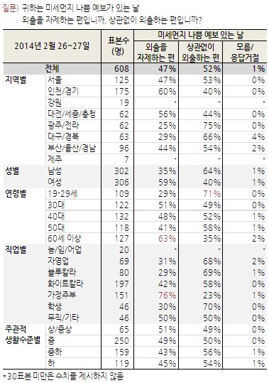 ¹Ì¼¼¸ÕÁö ³ª»Ý ¿¹º¸°¡ ÀÖÀ» ¶§ ¿ÜÃâÀ» ÀÚÁ¦ÇÏ´ÂÁö ¹°Àº °á°ú 47%´Â ‘¿ÜÃâÀ» ÀÚÁ¦ÇÏ´Â Æí’, 52%´Â '»ó°ü¾øÀÌ ¿ÜÃâÇÏ´Â Æí'À̶ó°í ´äÇØ ´ë·« ¹Ý¹ÝÀ¸·Î °¥·È´Ù.