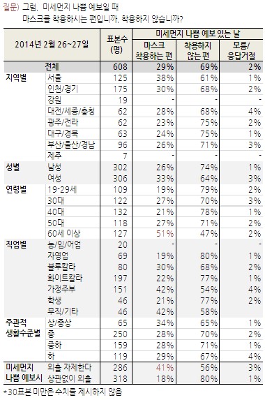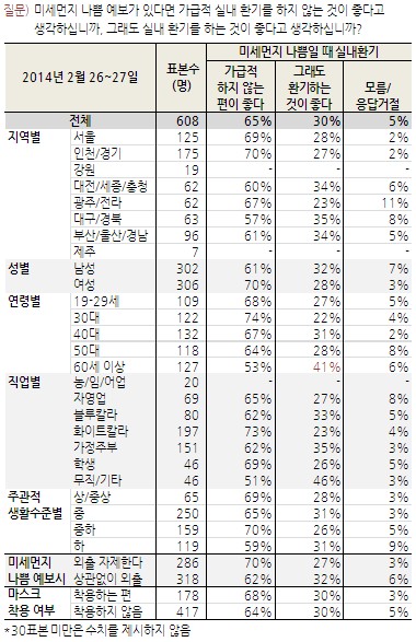 Àü¹®°¡µéÀº ¹Ì¼¼¸ÕÁö°¡ ³ª»Ý »óÅÂÀÏ ¶§ °¡±ÞÀû ¿ÜÃâÀ» ÀÚÁ¦Çϰí, ºÎµæÀÌÇÏ°Ô ¿ÜÃâÀ» ÇØ¾ß ÇÑ´Ù¸é ¹Ì¼¼¸ÕÁö ¹æÁö¿ë ¸¶½ºÅ© Âø¿ëÀ» ±ÇÀåÇϰí ÀÖ´Ù. ÇÏÁö¸¸ ¼ºÀÎÀÇ 29%¸¸ÀÌ ¹Ì¼¼¸ÕÁö ³ª»Ý ¿¹º¸ ½Ã ‘¸¶½ºÅ©¸¦ Âø¿ëÇÏ´Â Æí’À̾ú°í 69%´Â 'Âø¿ëÇÏÁö ¾Ê´Â Æí'À̶ó°í ´äÇß´Ù.
