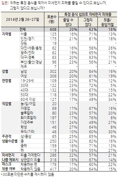 ±×·³¿¡µµ ¼ºÀÎÀÇ 20%´Â ‘ƯÁ¤À½½ÄÀ» ¸Ô¾î ¹Ì¼¼¸ÕÁö ÇÇÇØ¸¦ ÁÙÀÏ ¼ö ÀÖ´Ù’°í »ý°¢ÇÏ´Â °ÍÀ¸·Î ³ªÅ¸³µ´Ù. 62%´Â ‘±×·¸Áö ¾Ê´Ù’°í ´äÇß°í, 18%´Â ÀǰßÀ» À¯º¸Çß´Ù.
