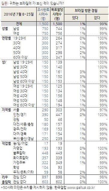 ³¡À¸·Î 2016³â Á¦31ȸ ¿Ã¸²ÇÈ °³ÃÖ±¹ÀÎ ºê¶óÁú ¹æ¹® °æÇèÀ» ¹°Àº °á°ú, Çѱ¹ ¼ºÀÎ Áß 1%°¡ 'ºê¶óÁú¿¡ °¡ º» Àû ÀÖ´Ù'°í ´äÇß´Ù. Áö³ 2012³â ·±´ø ¿Ã¸²ÇÈ Á÷Àü °³ÃÖ±¹ ¿µ±¹ ¹æ¹® °æÇèÀÚ´Â 3%, 2008³â ºÏ°æ ¿Ã¸²ÇÈ Á÷Àü Áß±¹ ¹æ¹® °æÇèÀÚ´Â 37%·Î Á¶»çµÈ ¹Ù ÀÖ´Ù.
