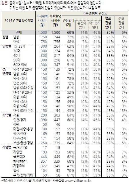 Çѱ¹°¶·´ÀÌ 2016³â 7¿ù 8ÀϺÎÅÍ 25ÀϱîÁö 17Àϰ£ Àü±¹(Á¦ÁÖµµ Á¦¿Ü) ¸¸ 19¼¼ ÀÌ»ó ³²³à 1,500¸í¿¡°Ô ¸®¿ì ¿Ã¸²ÇÈ¿¡ ´ëÇÑ °ü½É Á¤µµ¸¦ ¹°Àº °á°ú '°ü½É ¸¹´Ù' 14%, '¾î´À Á¤µµ °ü½É ÀÖ´Ù' 46% µî 60%°¡ '°ü½É ÀÖ´Ù'°í ´äÇß´Ù. 'º°·Î °ü½É ¾ø´Ù'´Â 35%, 'ÀüÇô °ü½É ¾ø´Ù'´Â 6%¿´´Ù. ¿Ã¸²ÇÈ¿¡ '°ü½É ÀÖ´Ù'´Â ÀÀ´äÀº ¿©¼º(48%)º¸´Ù ³²¼º(72%)¿¡¼ ¸¹¾Ò´Ù.
