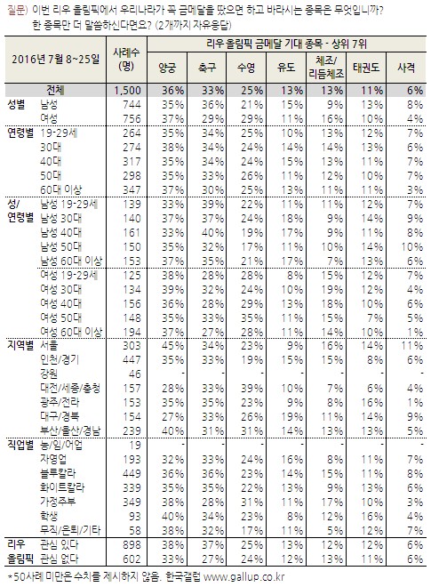 ¸®¿ì ¿Ã¸²ÇÈ¿¡¼ ¿ì¸®³ª¶ó°¡ ²À ±Ý¸Þ´ÞÀ» ¶¤À¸¸é ÇÏ°í ¹Ù¶ó´Â Á¾¸ñÀº(2°³±îÁö ÀÚÀ¯ÀÀ´ä) '¾ç±Ã'(36%), 'Ã౸'(33%), ''¼ö¿µ'(25%), 'À¯µµ'(13%), 'üÁ¶/¸®µëüÁ¶'(13%), 'űǵµ'(11%), '»ç°Ý'(6%), '·¹½½¸µ'(6%), 'ʱ¸'(4%), '¹èµå¹ÎÅÏ'(4%), 'Ææ½Ì'(4%) µîÀÌ 10À§±Ç¿¡ µé¾ú´Ù.