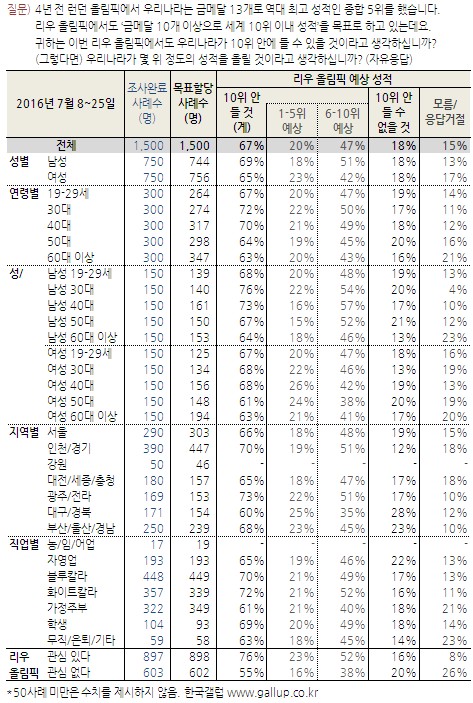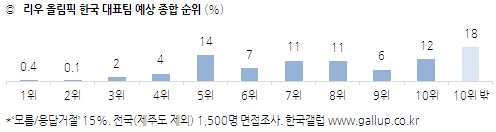 Çѱ¹ ´ëÇ¥ÆÀÀÇ À̹ø ¸®¿ì ¿Ã¸²ÇÈ ¸ñÇ¥´Â '±Ý¸Þ´Þ 10°³ ÀÌ»óÀ¸·Î ¼¼°è 10À§ À̳» ¼ºÀû'ÀÌ´Ù. ¿ì¸® ±¹¹Î 67%´Â ÀÌ ¸ñÇ¥°¡ ´Þ¼ºµÉ °ÍÀ¸·Î ³»´ÙºÃ°í, 18%´Â '10À§ ¾È¿¡ µé ¼ö ¾øÀ» °Í'À̶ó°í ´äÇßÀ¸¸ç 15%´Â Àü¸ÁÀ» À¯º¸Çß´Ù.